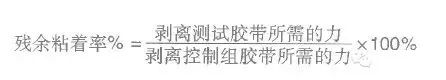 殘余接著強度指壓敏膠面材在指定條件下與硅酮離型底材先接觸,之后將其貼在標準測試板上制成標準測試片,之后在固定的剝離角度、速度下,從標準試片上將其剝離時所需要的力。而殘余接著率是以百分比表示的,是將上述壓敏膠面材殘余粘著強度比上同一面材在不接觸硅酮離型底材前提下與標準測試版貼合所產(chǎn)生的粘著強度的比值。